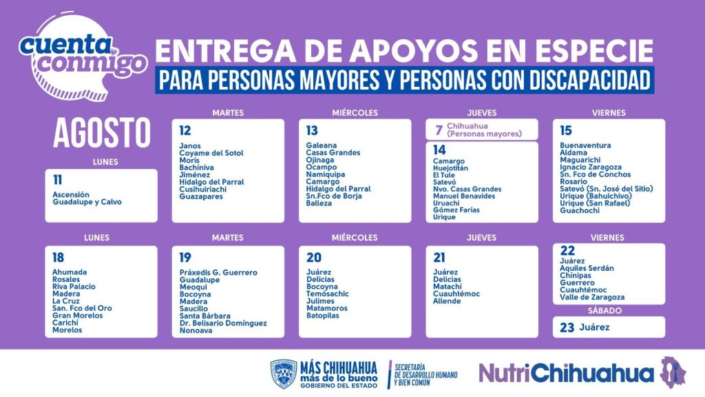 Las entregas iniciarán el 7 de agosto en Chihuahua únicamente para adultos mayores, toda vez que las fechas de reparto de apoyos para personas con discapacidad se darán a conocer posteriormente.