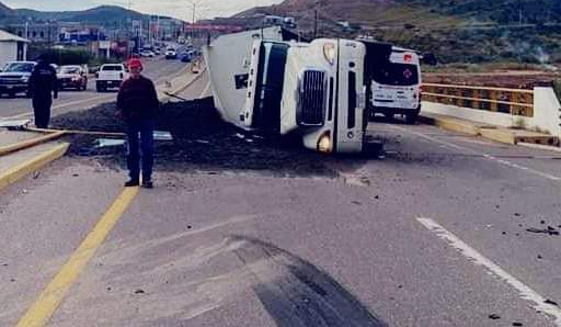 Esta mañana, cerca de las 8:30 horas, un dompe cargado con jal salió del camino y terminó volcándose en la vía corta a Chihuahua. a la altura de la Colonia San José, dejando a dos personas lesionadas.