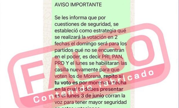 “AVISO IMPORTANTE: Se les informa que por cuestiones de seguridad, se estableció como estrategia qué se realizará la votación en 2 fechas el domingo será para los partidos qué no se encuentran en el poder, es decir PRI, PAN, PRD Y el lunes se habilitaran las casilla nuevamente para que voten los de Morena, repito si tu voto es por morena la fecha en la cual te debes presentar es el lunes 3 de junio corran la voz para tener mayor seguridad en estas votaciones”.