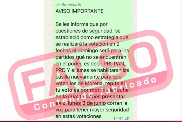 “AVISO IMPORTANTE: Se les informa que por cuestiones de seguridad, se estableció como estrategia qué se realizará la votación en 2 fechas el domingo será para los partidos qué no se encuentran en el poder, es decir PRI, PAN, PRD Y el lunes se habilitaran las casilla nuevamente para que voten los de Morena, repito si tu voto es por morena la fecha en la cual te debes presentar es el lunes 3 de junio corran la voz para tener mayor seguridad en estas votaciones”.