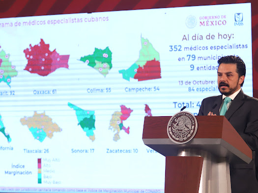 El director general del Instituto Mexicano del Seguro Social (IMSS), Zoé Robledo, informó que ha arribado al país 352 médicos y médicas especialistas provenientes de Cuba, quienes han sido ubicados en 79 municipios de nueve entidades en regiones y jurisdicciones sanitarias que tienen alta o muy alta marginación, o en hospitales con vacancias que llevaban años sin cubrirse.