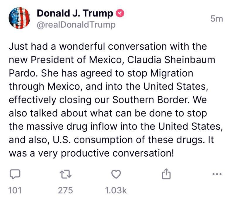 “Acabo de tener una maravillosa conversación con la nueva presidenta de México, Claudia Sheinbaum Pardo (…) También hablamos sobre qué se puede hacer para detener el enorme flujo de drogas hacia los Estados Unidos y, además, sobre el consumo de estas drogas en EU. ¡Fue una conversación muy productiva!”