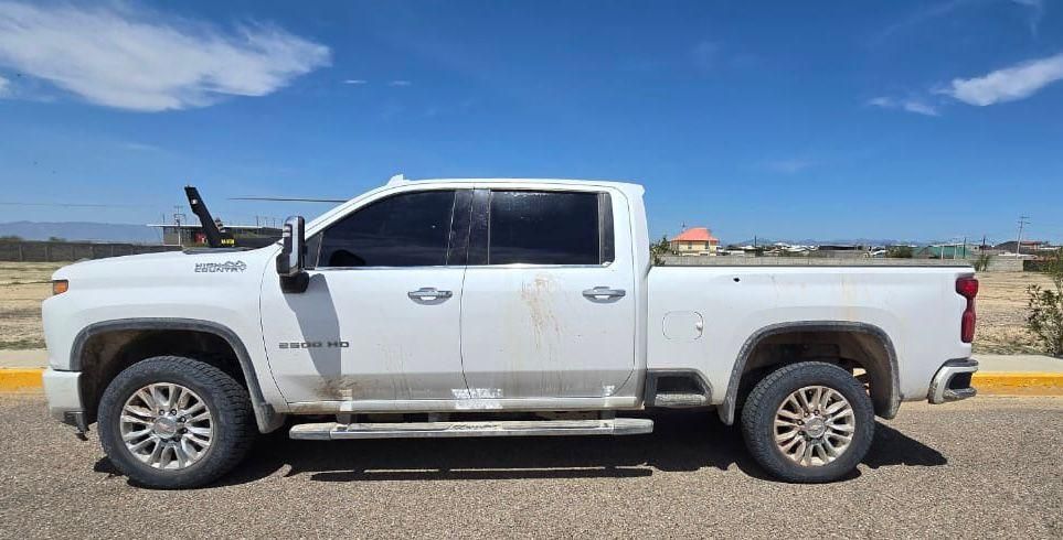Pick up Chevrolet color blanca modelo High Country con matrícula de Texas; pick up Chevrolet Silverado color blanco, con reporte de robo.