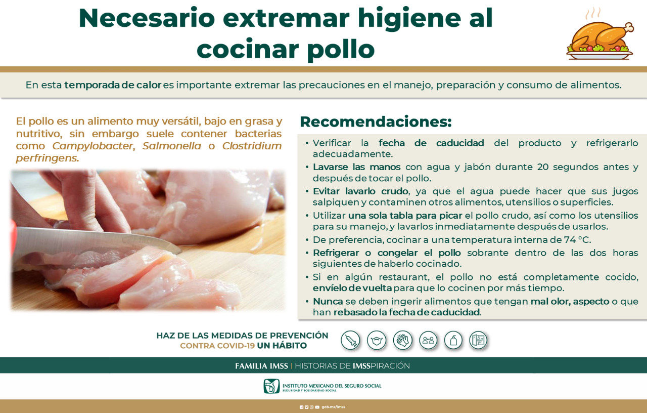 El Instituto Mexicano del Seguro Social (IMSS) en Chihuahua, informa a la población la importancia de manejar y cocinar correctamente el pollo, ya que de no hacerlo se pone en riesgo la salud al provocar una intoxicación alimentaria.