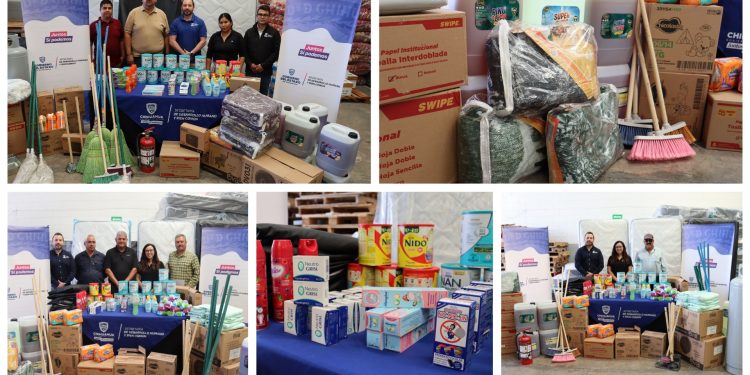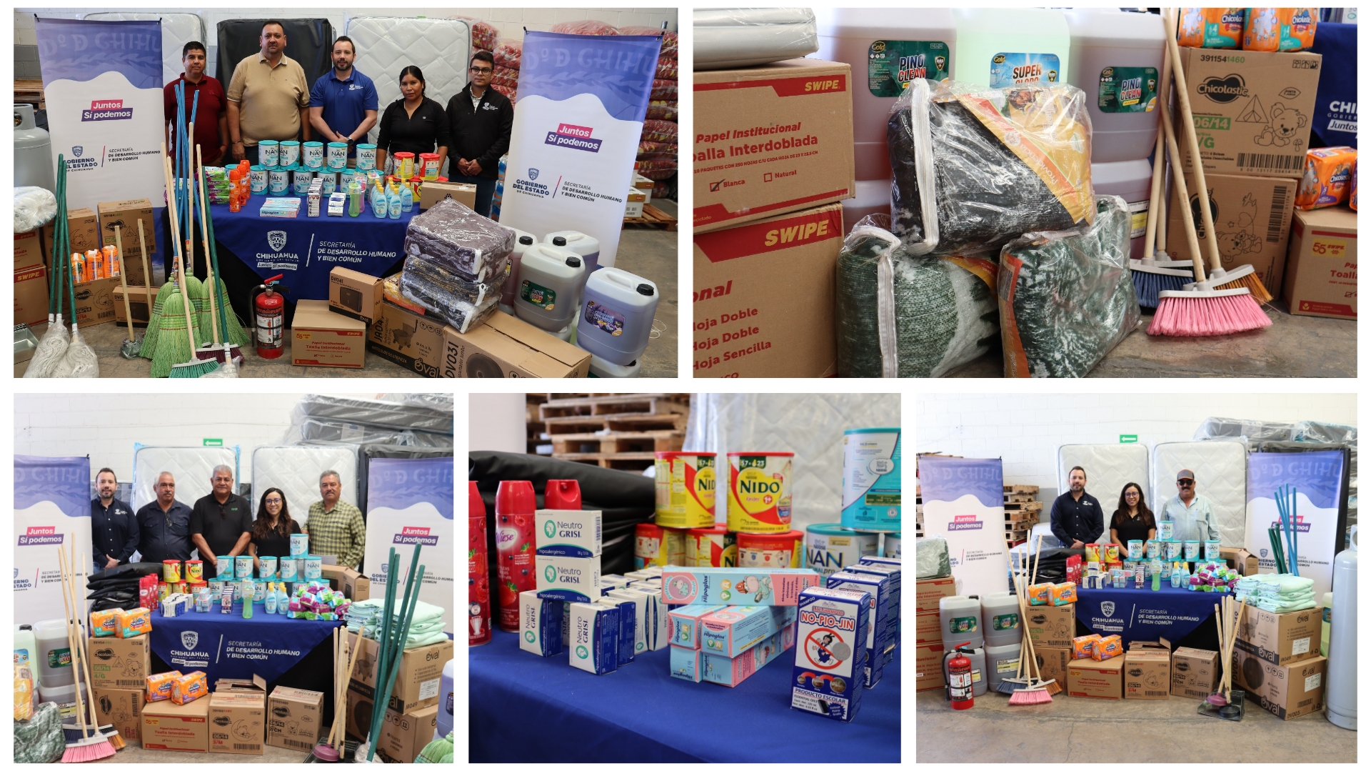 El material entregado incluye colchones, cobijas matrimoniales y fundas anti-ácaros, frazadas; artículos de higiene y cuidado como jabones neutros, champús, toallitas húmedas, crema corporal y para rozaduras, pañales y fórmulas lácteas, y papel higiénico.