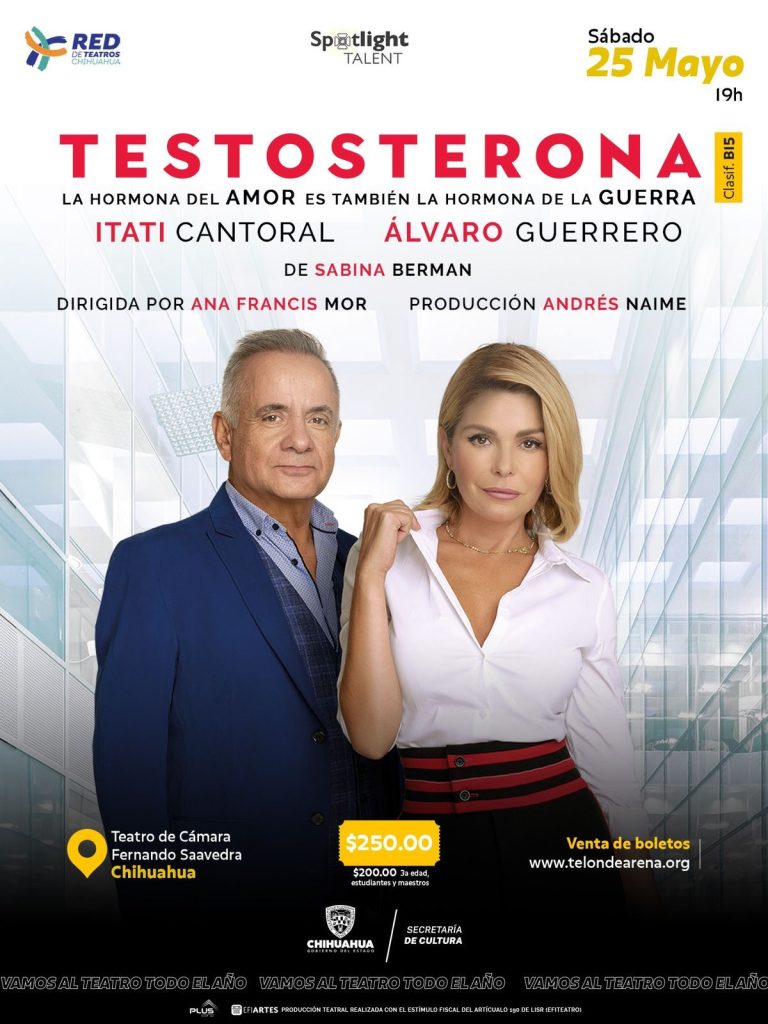 Con la obra “Testosterona”, los actores Itatí Cantoral y Álvaro Guerrero abrirán las actividades de la Red de Teatros 2024, que se presenta los días 24 y 25 de mayo en las ciudades de Juárez y Chihuahua, respectivamente.