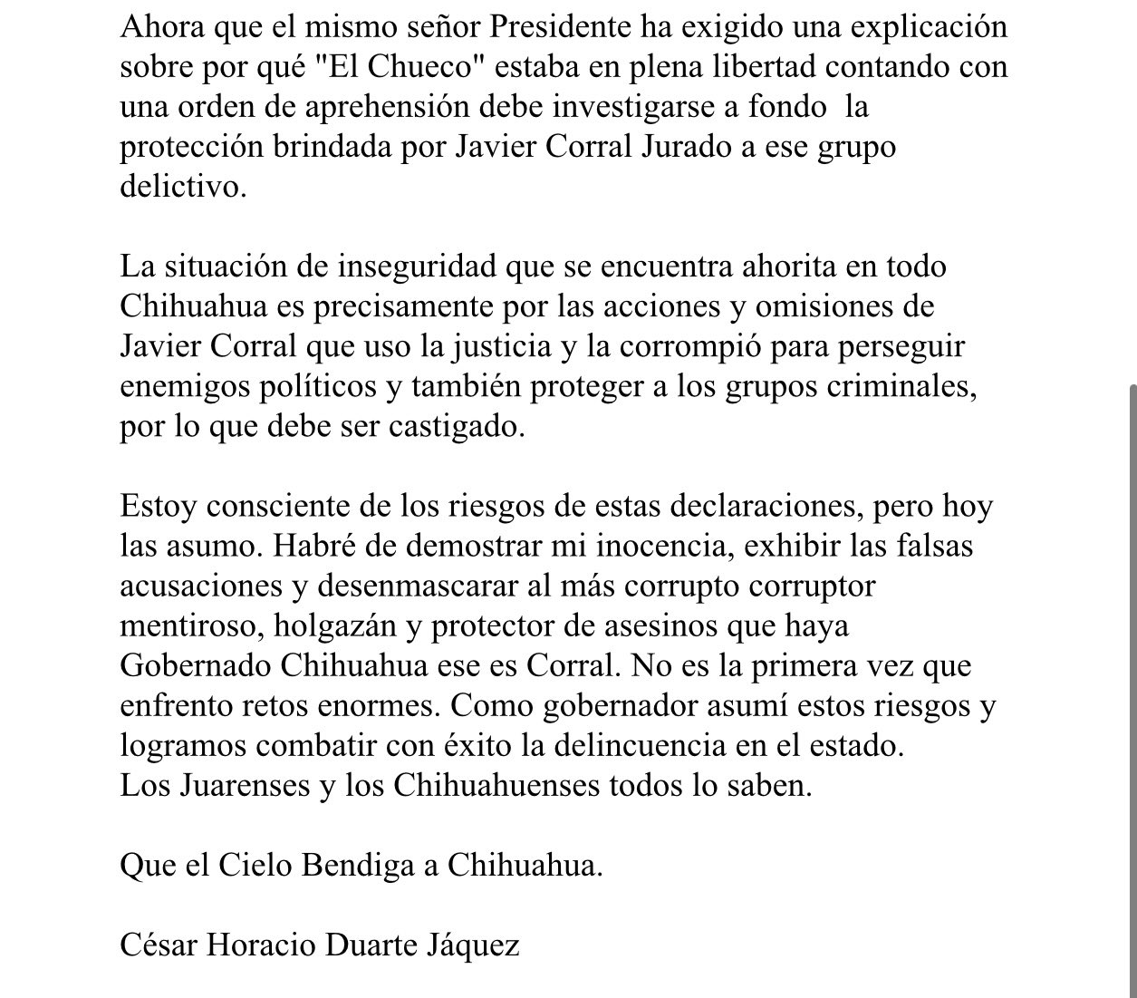 Estoy consciente de los riesgos de estas declaraciones, pero hoy las asumo. Habré de demostrar mi inocencia, exhibir las falsas acusaciones y desenmascarar al más corrupto corruptor mentiroso, holgazán y protector de asesinos que haya Gobernado Chihuahua ese es Corral. No es la primera vez que enfrento retos enormes. Como gobernador asumí estos riesgos y logramos combatir con éxito la delincuencia en el estado.