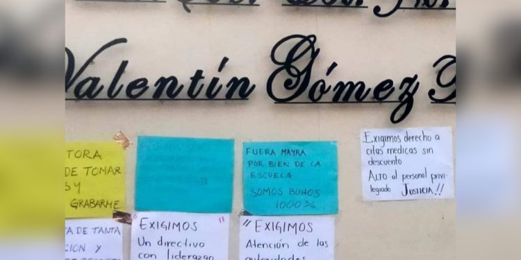 Personal docente y administrativo de la Secundaria Estatal «Valentín Gómez Farías», organizaron una manifestación en la institución para exigir la salida de la directora de la misma, bajo acusaciones sobre supuestos malos manejos financieros, acoso laboral y tratos despóticos tanto a alumnos como a los maestros.