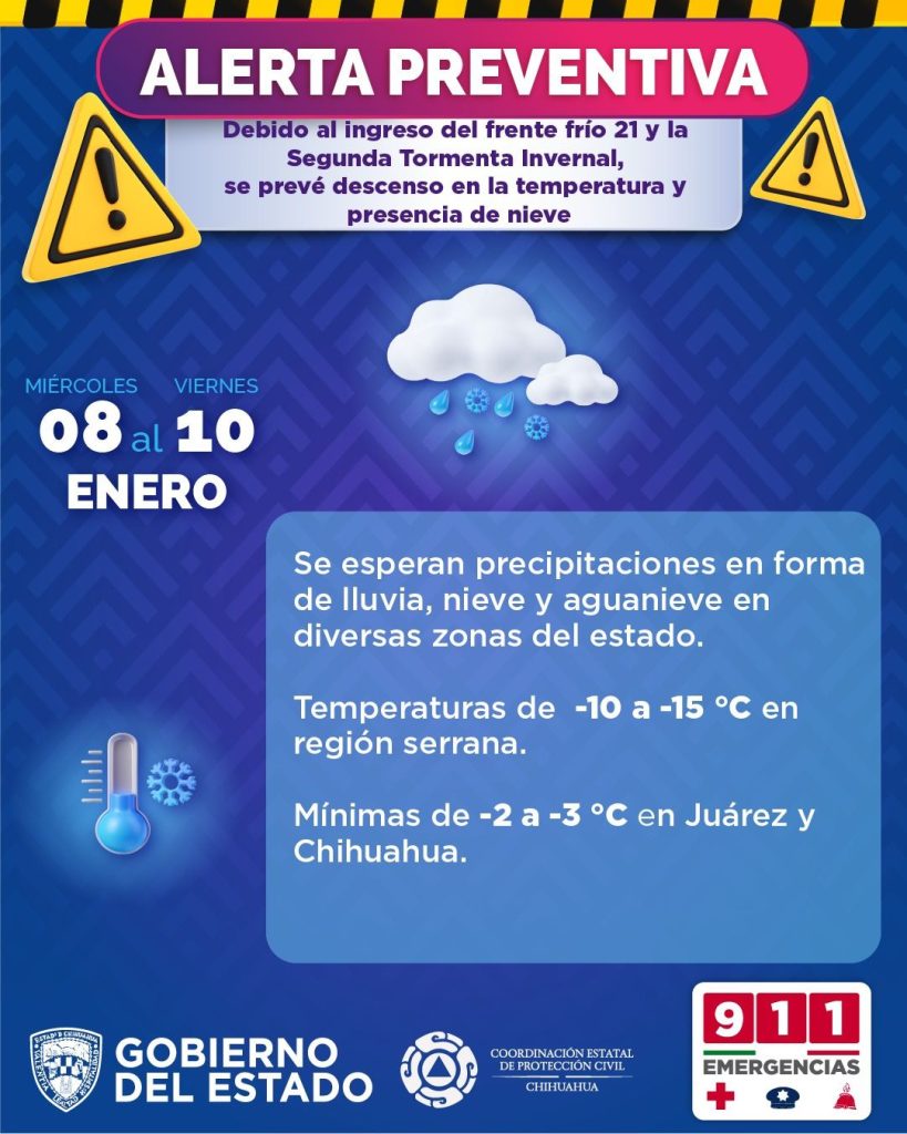 La Coordinación Estatal de Protección Civil (CEPC) informó que derivado del frente frío número 21 y la Segunda Tormenta Invernal de la temporada, se espera un marcado descenso de las temperaturas para los próximos días, además de vientos que alcanzarán los 85 kilómetros por hora (km/h) este miércoles.