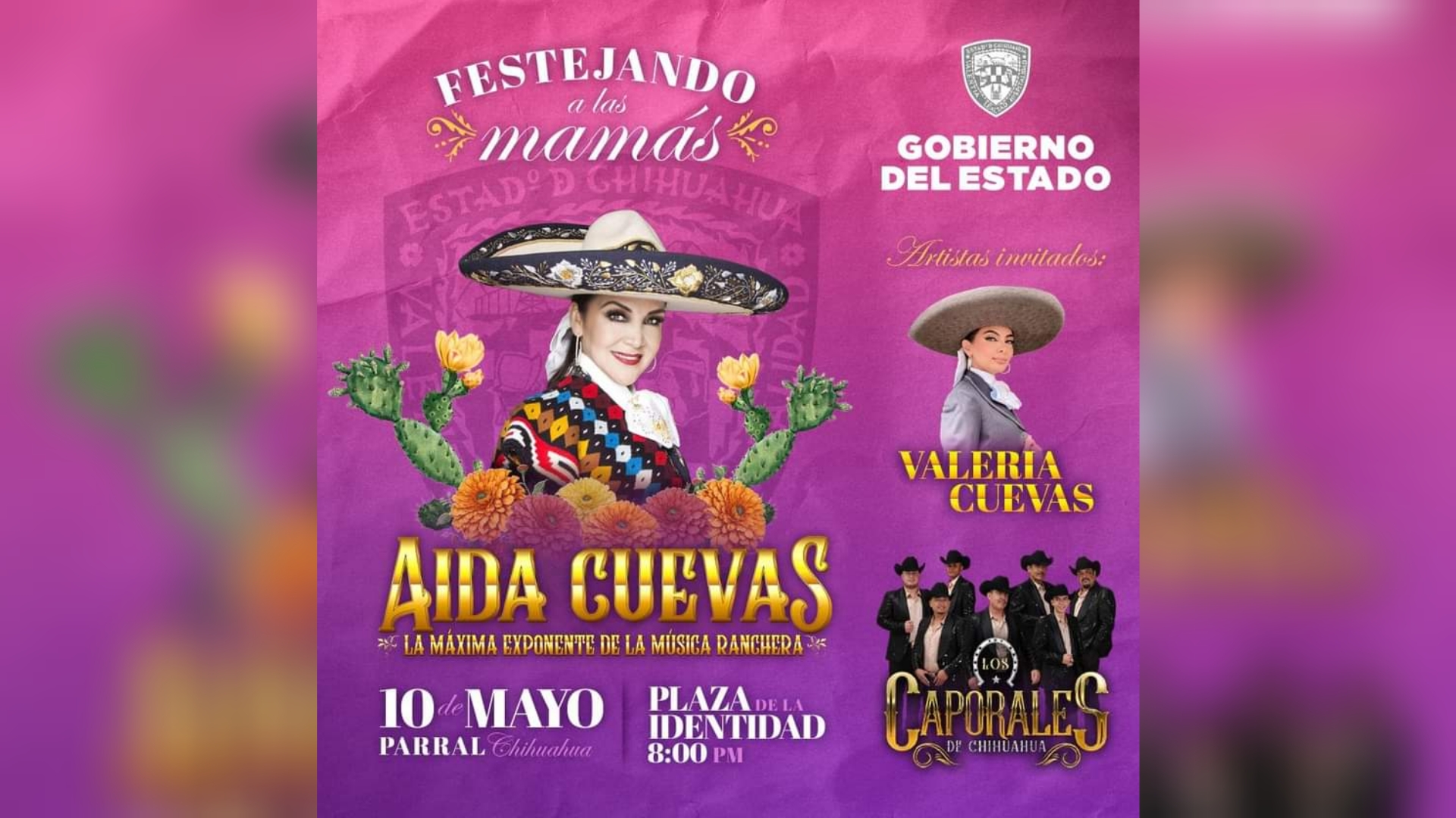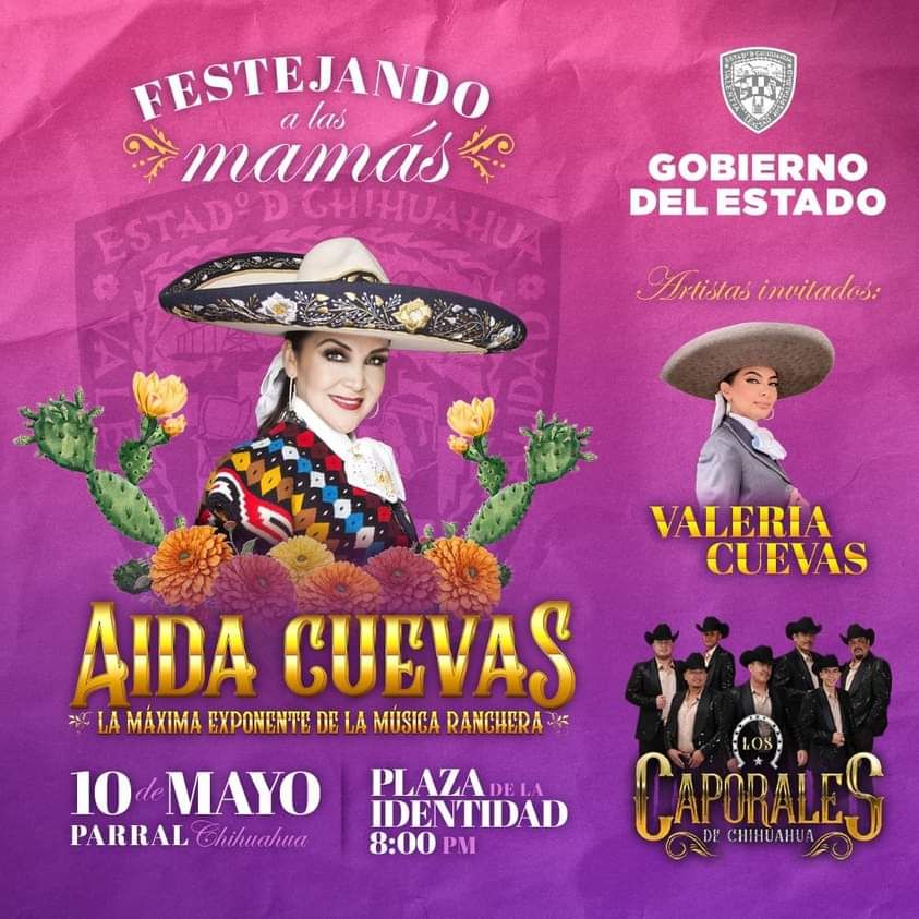 La máxima exponente de la música ranchera cantará sus conocidos éxitos en un festejo para las mamás en el que también actuarán Valeria Cuevas y los Caporales de Chihuahua, entre otras actividades.