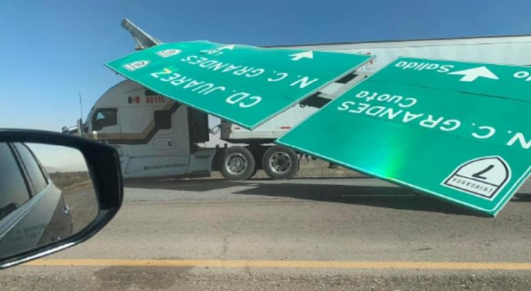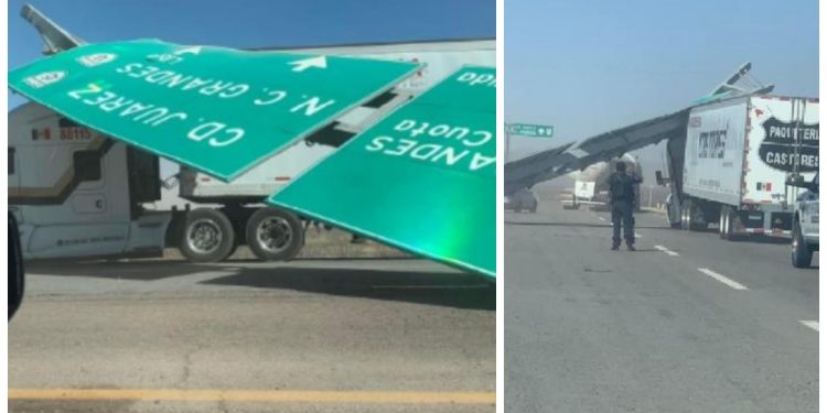 Ciudadanos reportaron un incidente en el kilómetro 104 de la carretera a Ciudad Juárez, donde un señalamiento vial de tamaño grande quedó desprendido y terminó encima de un tráiler que circulaba por ese tramo.