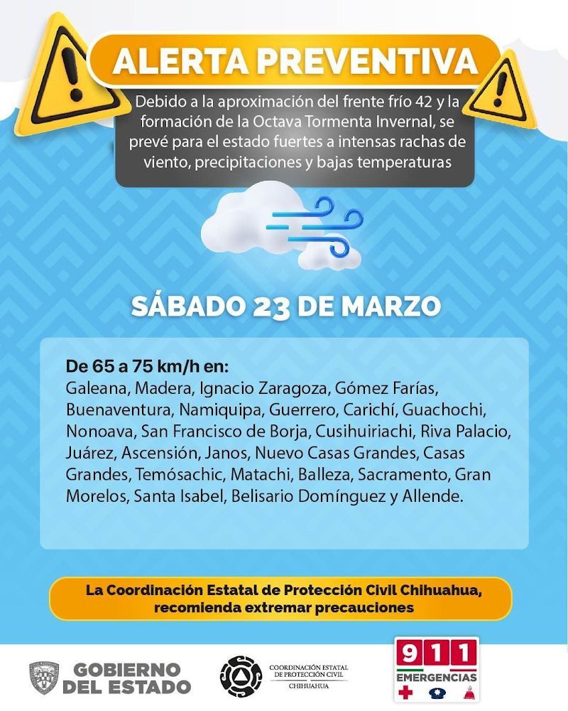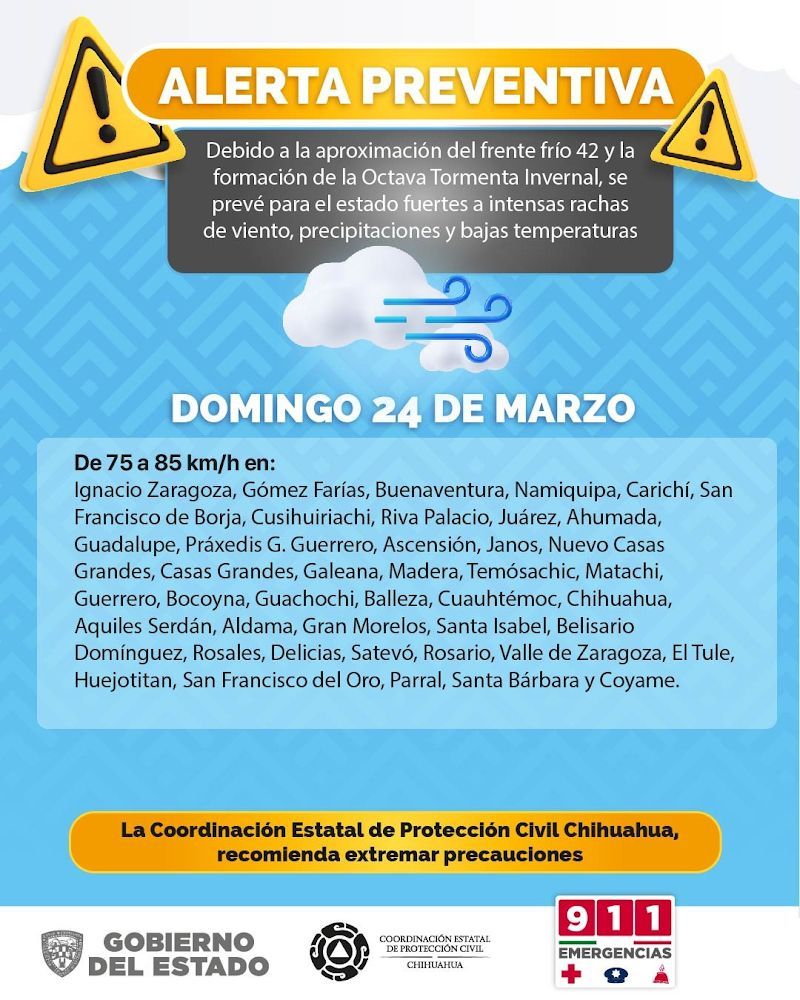 Para el domingo 24 se anticipa el ingreso del sistema frontal 42, lo que generará que las rachas de viento de 75 y 85 km/h en Galeana, Ignacio Zaragoza, Gómez Farías, Buenaventura, Namiquipa, Guerrero, Carichí, Nonoava, San Francisco de Borja, Cusihuiriachi, Cuauhtémoc, Riva Palacio, Juárez, Ahumada, Guadalupe, Práxedis G. Guerrero, Ascensión y Janos.
