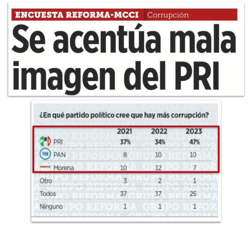 Las encuestas reflejan de manera contundente esta realidad. El PRI es percibido por la población como el partido con mayor índice de corrupción, y los ciudadanos mexicanos somos plenamente conscientes de ello. La mala imagen del partido se incrementa conforme pasa el tiempo, lo cual no hace más que confirmar nuestras preocupaciones.