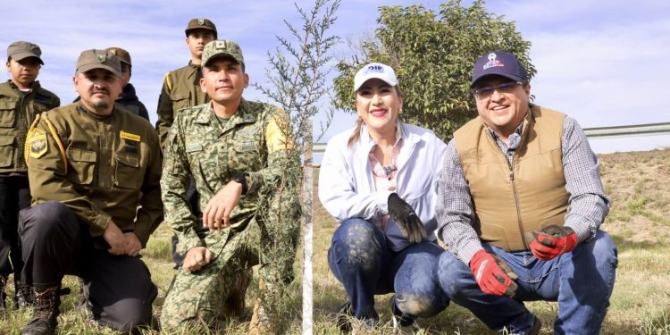 Con el objetivo de fortalecer el cuidado del medio ambiente y avanzar hacia una ciudad más sostenible, el presidente municipal de Parral, Salvador Calderón, acompañado de su esposa Nora Carrillo, encabezó una jornada de reforestación en la que se plantaron 100 árboles de pino y encino en las inmediaciones del 76/o Batallón de Infantería.