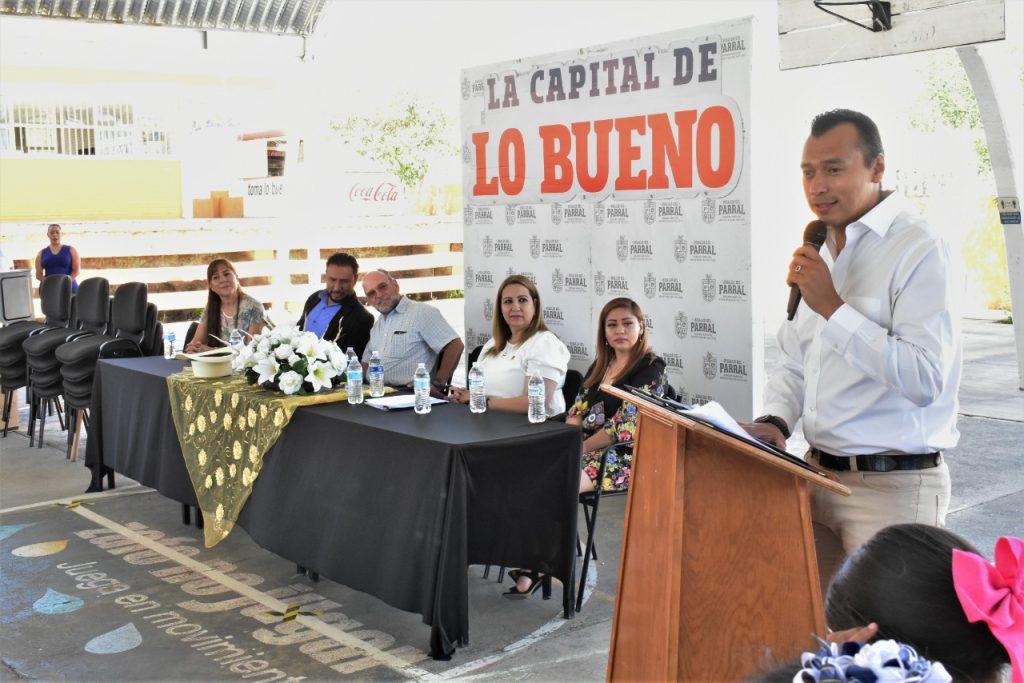 Con presencia de Carlos Bremer, titular del Empresariado Chihuahuense en Parral, su coordinadora, Claudia Villalobos, la presidenta de la sociedad de alumnos, Nora Raña Velázquez, el director del plantel, Daniel Vega, y Otilia Torresdey de Vinculación Educativa, el presidente municipal hizo patente el trabajo conjunto que ha permitido apoyar diferentes escuelas.