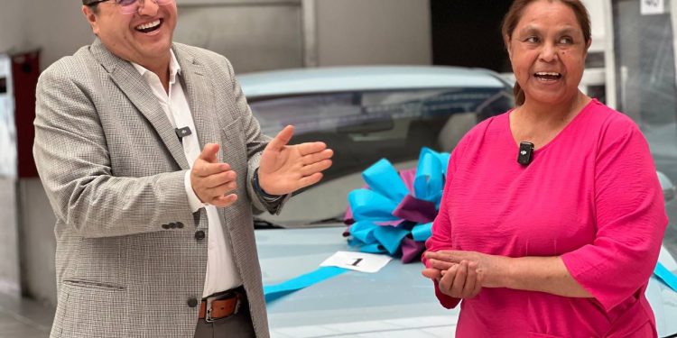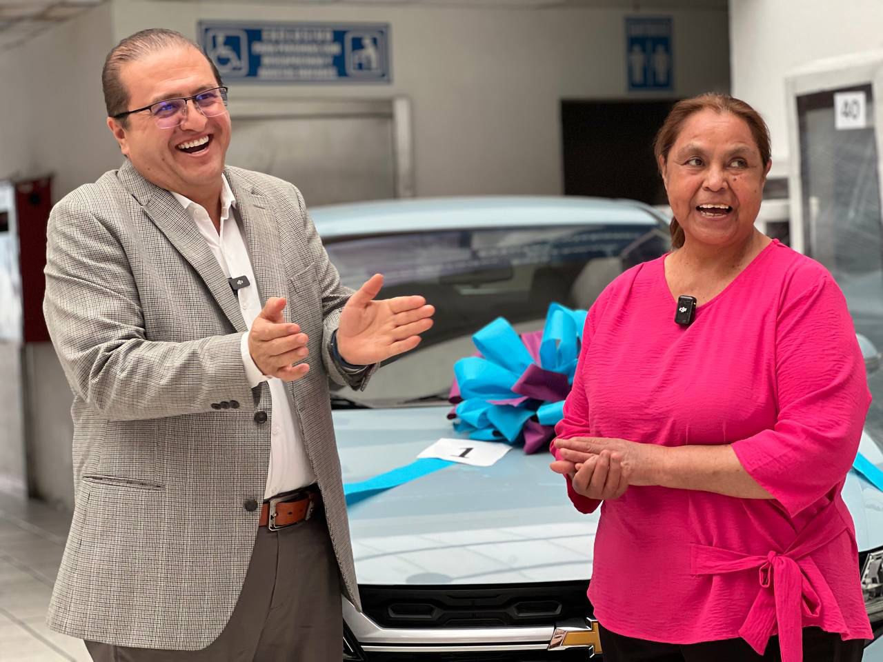 El presidente municipal de Parral, Salvador Calderón, encabezó la entrega de un automóvil del año a Tomasa Peinado, ganadora del premio mayor del Sorteo del Predial 2026 con el número 3527, en un evento realizado en el patio central de la Presidencia Municipal.