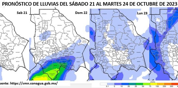 En cuanto al domingo 22 de octubre, se esperan lluvias de fuertes a puntualmente muy fuertes (de 50.1 a 75 mm) en parte de la zona suroeste, incluye Guadalupe y Calvo; así como moderadas a puntualmente fuertes (de 25.1 a 50 mm) en las zonas suroeste y sur, las mismas pueden estar acompañadas de actividad eléctrica y posible caída de granizo.