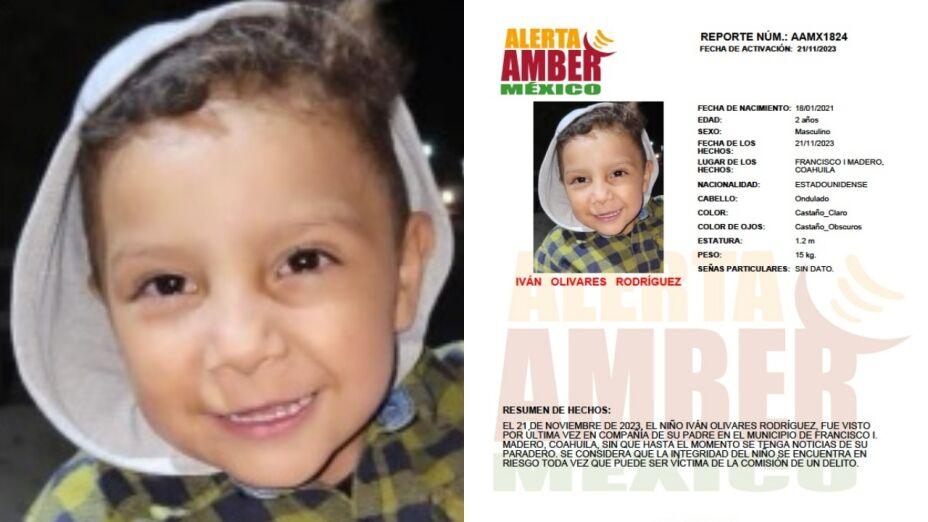 La Fiscalía General del Estado de Coahuila activó la Alerta AMBER para pedir apoyo a la ciudadanía con el fin de localizar a Iván Olivares Rodríguez, un menor de dos años de edad que fue visto por última vez el pasado martes 21 de noviembre.