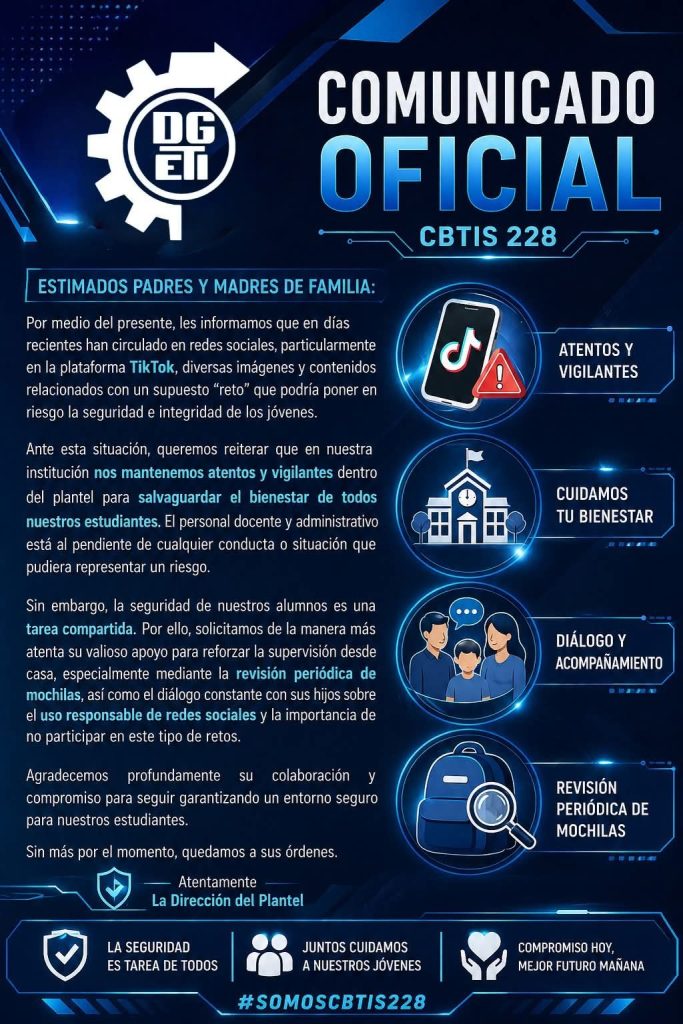 Ante la circulación reciente de contenidos en redes sociales que podrían poner en riesgo a estudiantes, el CBTIS 228 emitió un comunicado dirigido a madres y padres de familia, en el que llama a reforzar la supervisión y el acompañamiento desde casa.