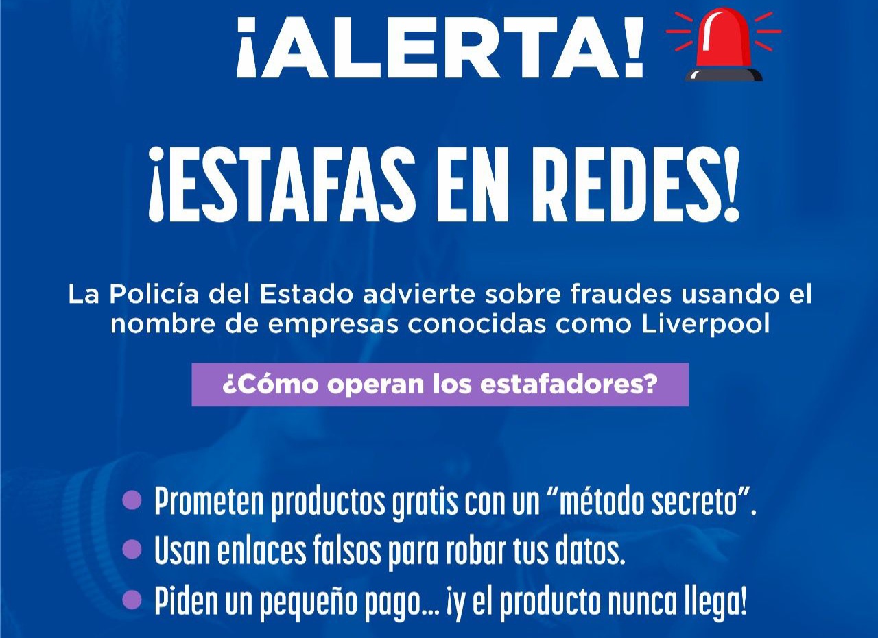 La Secretaría de Seguridad Pública del Estado (SSPE) advierte a la ciudadanía sobre una nueva estafa detectada en redes sociales, en la que delincuentes utilizan el nombre de empresas reconocidas y tiendas departamentales de renombre, para engañar a usuarios con supuestas promociones.