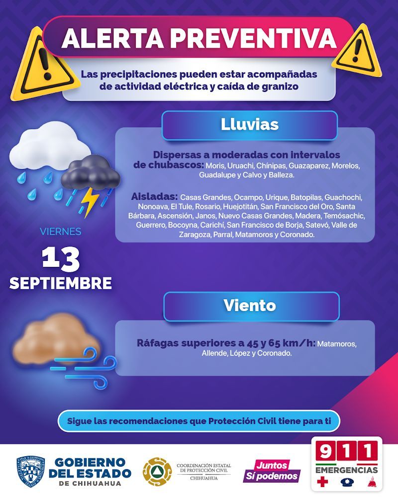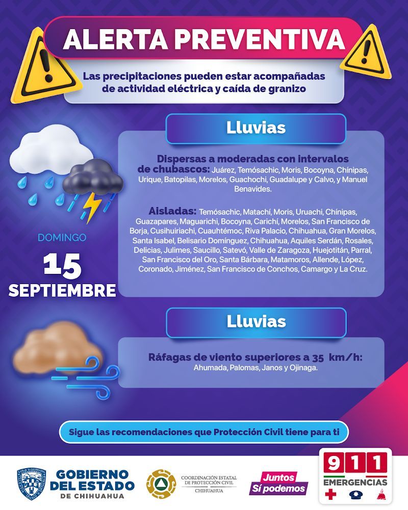 Condiciones similares se esperan en Aquiles Serdán, Rosales, Delicias, Julimes, Saucillo, Satevó, Valle de Zaragoza, Huejotitán, Parral, San Francisco del Oro, Santa Bárbara, Matamoros, Allende, López, Coronado, Jiménez, San Francisco de Conchos, Camargo y La Cruz.