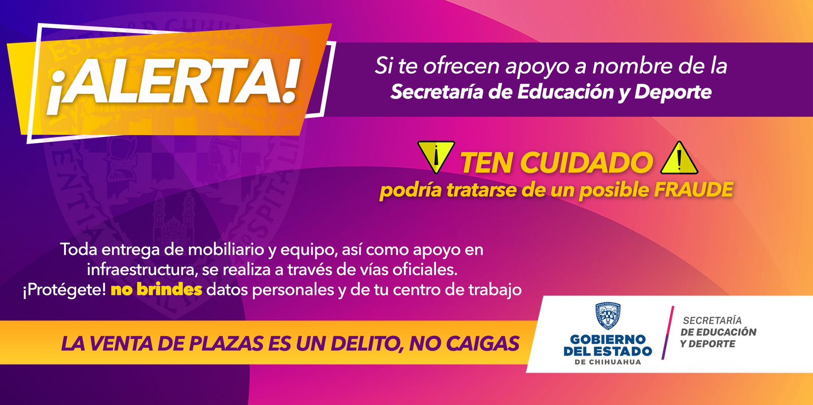 La Secretaría de Educación y Deporte (SEyD), alertó a autoridades municipales y educativas, así como al público en general, ante un método de estafa vía telefónica, en el que presuntos “funcionarios” de la dependencia ofrecen la entrega de mobiliario, equipo de trabajo o plazas docentes, a cambio de una remuneración económica.