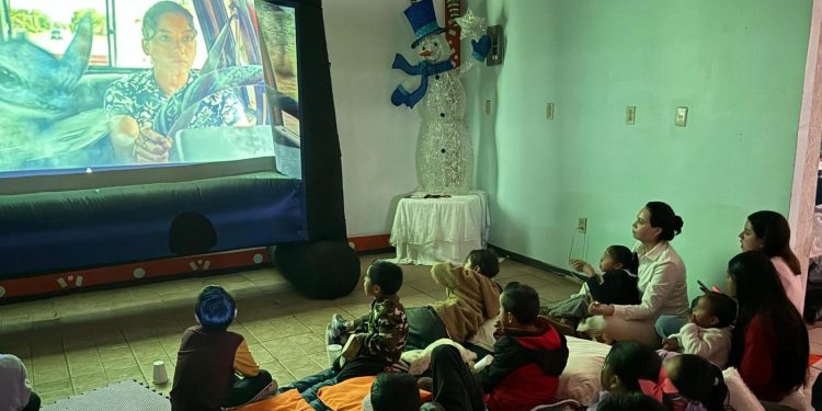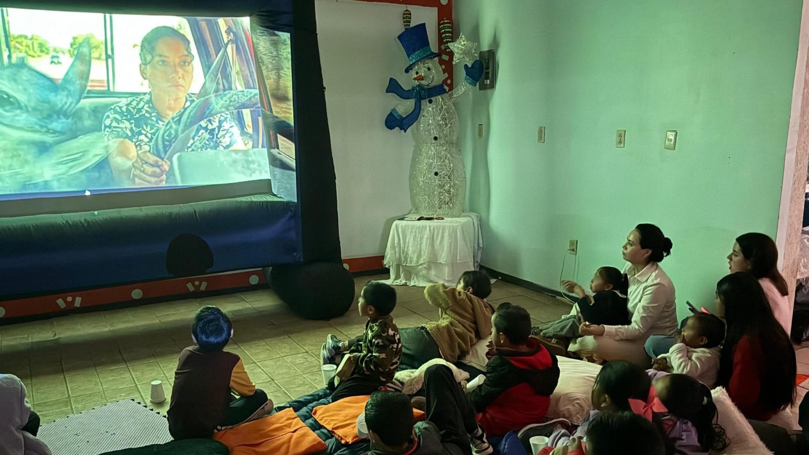 El espacio fue acondicionado con colchonetas, almohadas y un entorno cálido que permitió a las familias relajarse y compartir una tarde especial, disfrutando de las películas más recientes en un ambiente seguro y agradable.