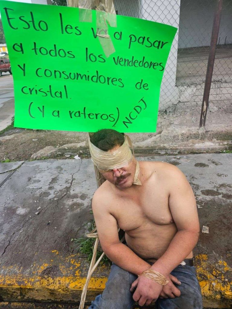 Algunas de las leyendas advertían que «eso les va a pasar a los que consuman o vendas cristal y a los rateros», y están firmados supuestamente por las iniciales NCDJ, mismas que harían referencia al Nuevo Cartel de Juárez.