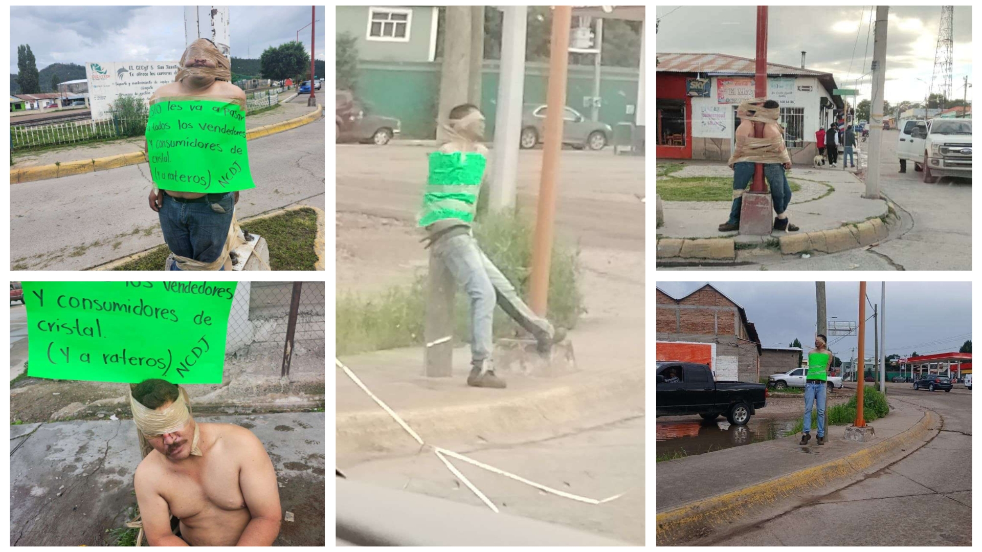 A unas horas de que agentes de la Secretaría de Seguridad Pública del Estado (SSPE), fueran atacados a balazos en San Juanito, municipio de Bocoyna, siete hombres fueron amarrados a postes en la calle principal y a varios les dejaron mensajes amenazantes en cartulinas pegadas a sus cuerpos.