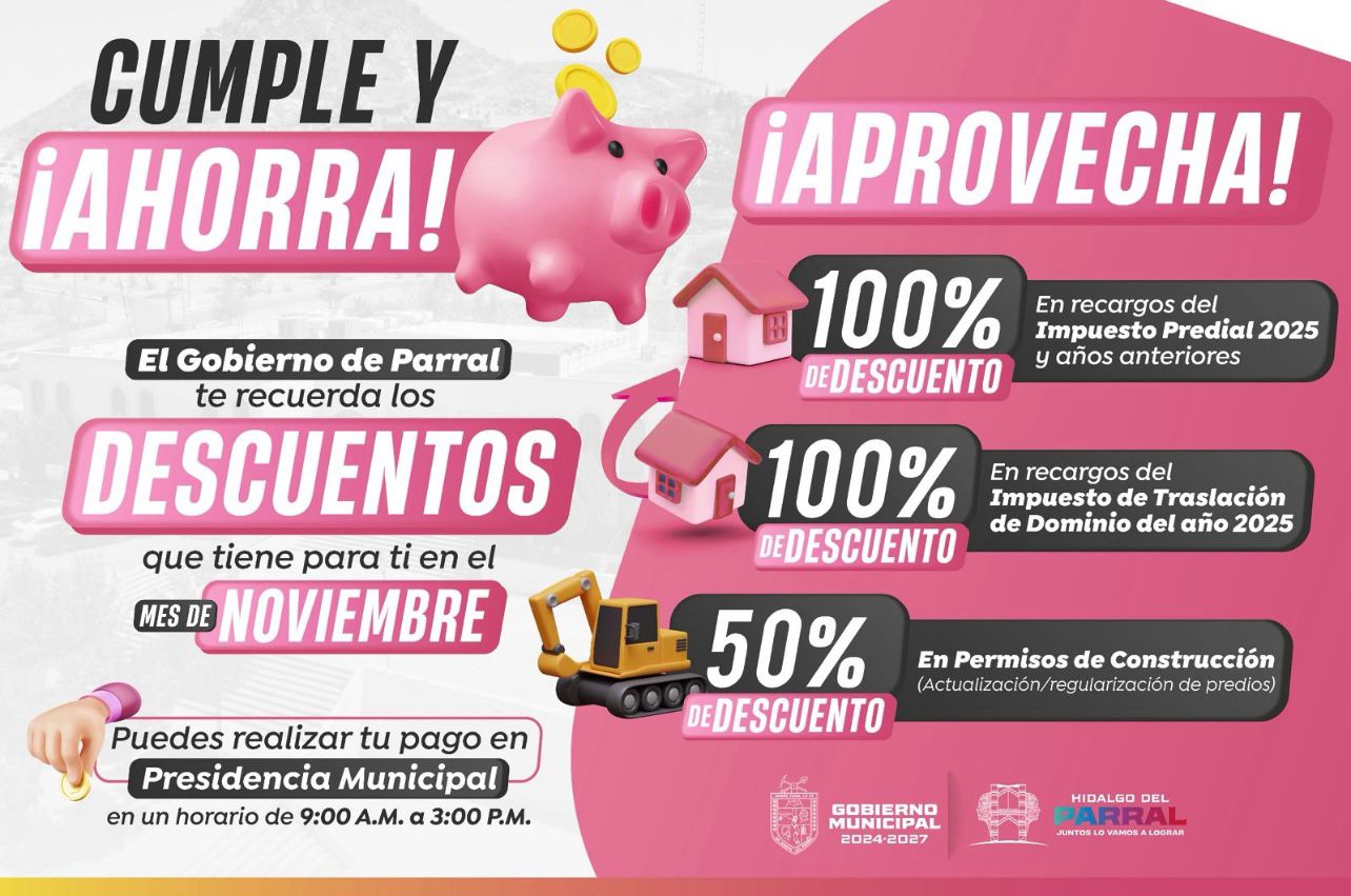 La titular de Catastro Municipal, Karla Loya Ornelas, informó que se ofrecerá un 100% de descuento en recargos del Impuesto Predial 2025 y años anteriores, así como un 100% de descuento en recargos del Impuesto de Traslación de Dominio del año 2025.
