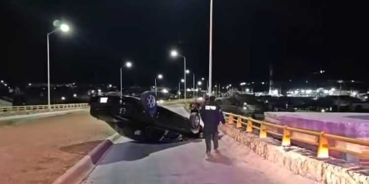 Un automóvil terminó volcado la noche de este martes sobre la Vialidad Ferrocarril, a la altura de la Unidad Deportiva Vanessa Zambotti, lo que generó la rápida intervención de corporaciones de seguridad y paramédicos.