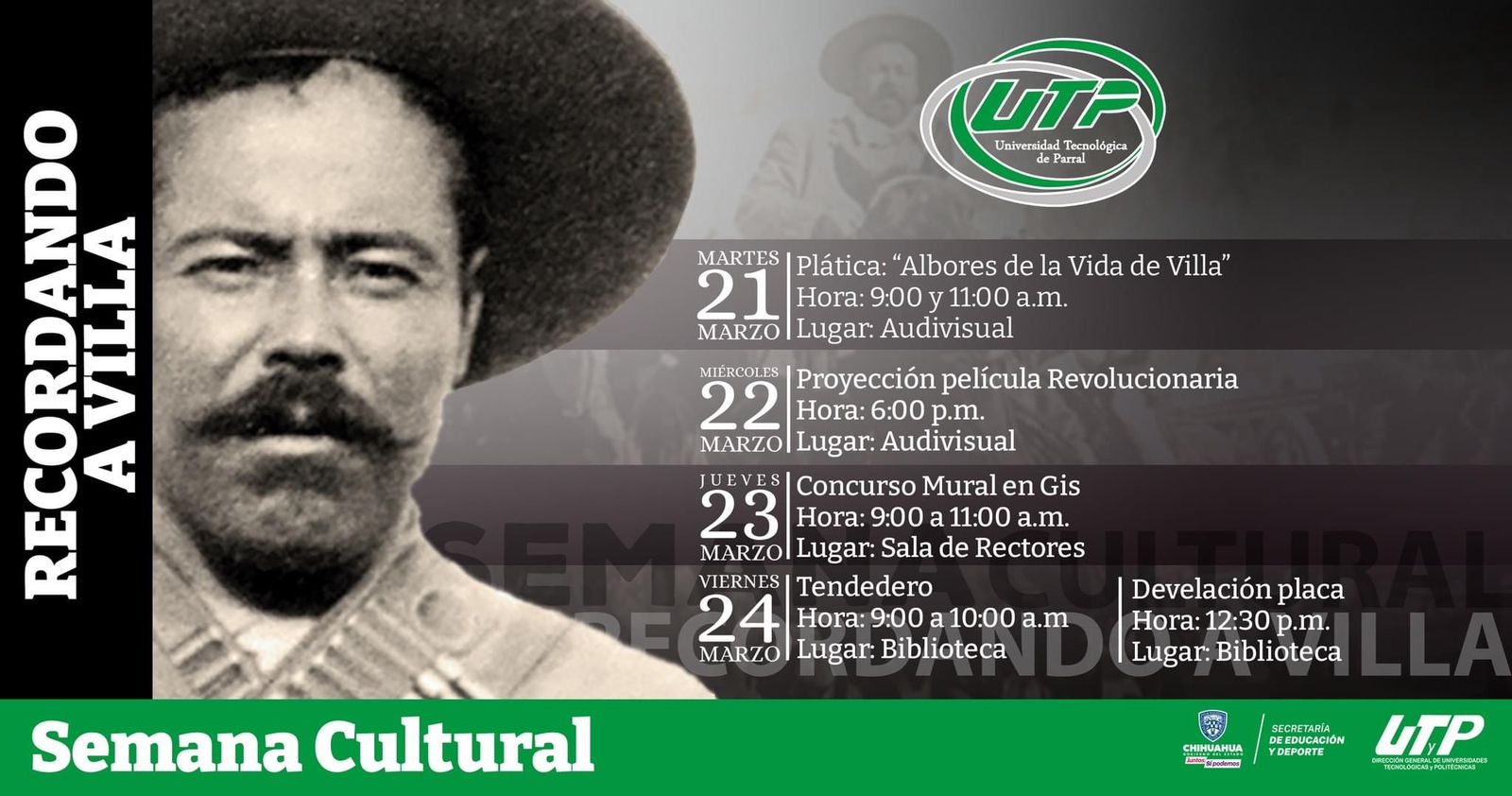 Este martes 21 de marzo, arranca la Semana Cultural “Recordando a Villa” en la Universidad Tecnológica de Parral (UTP) con distintas actividades a propósito del centenario de la muerte del “revolucionario del pueblo”.