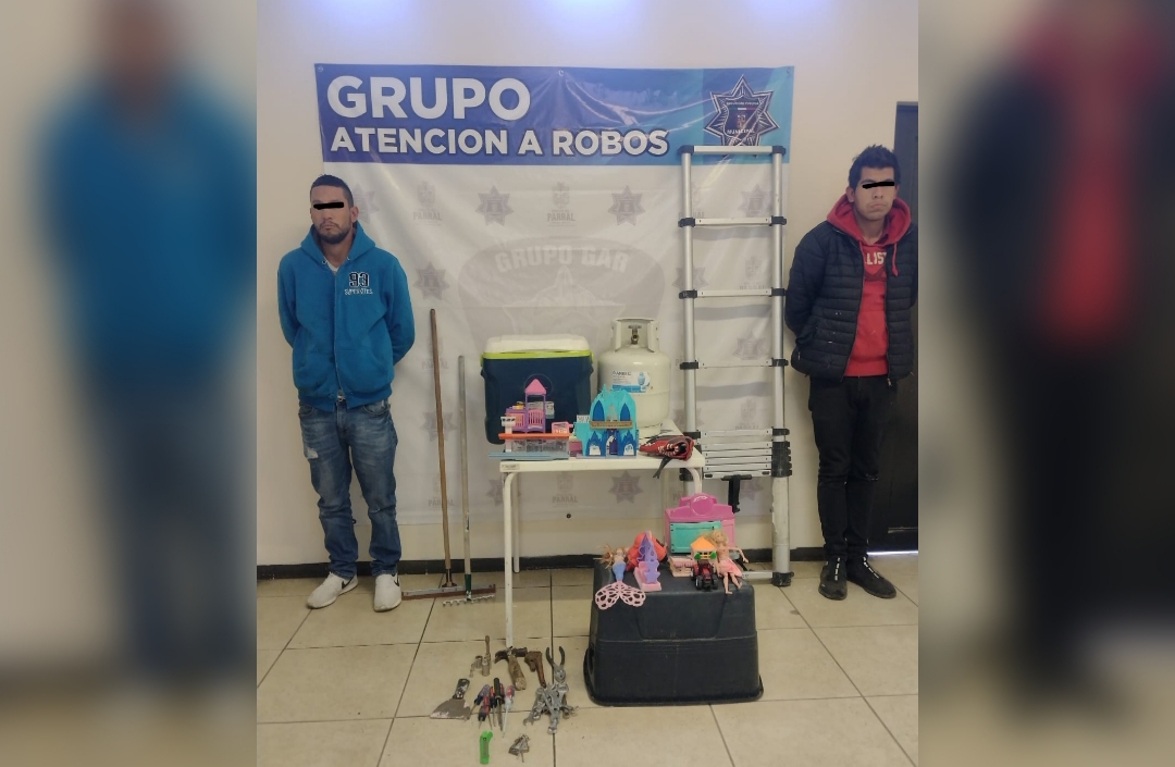 Elementos del Grupo Especial de Atención a Robos de la Dirección General de Seguridad Pública Municipal detuvieron a dos sujetos en posesión de más de 40 objetos que presumiblemente fueron sustraídos del interior de un domicilio ubicado en la colonia San Antonio de las Huertas.