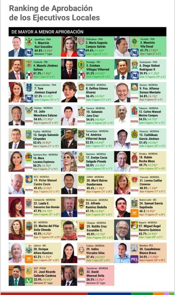El Top 5 de los gobernadores mejor evaluados lo encabeza Mauricio Kuri, de Querétaro; en tercer sitio se ubica Mauricio Vila, de Yucatán; le sigue Manolo Jiménez, de Coahuila y Esteban Villegas, de Durango.