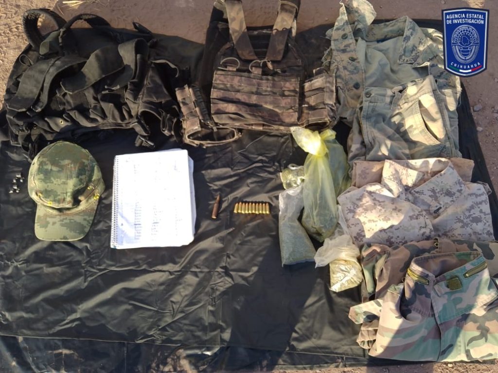 - Equipo táctico consistente en 2 pecheras con porta cargadores, 2 uniformes pixeleados, 10 cartuchos útiles calibre 9mm, un cartucho útil calibre .308, 4 cartuchos útiles de calibre 7.62×39 y 2 radios de comunicación.