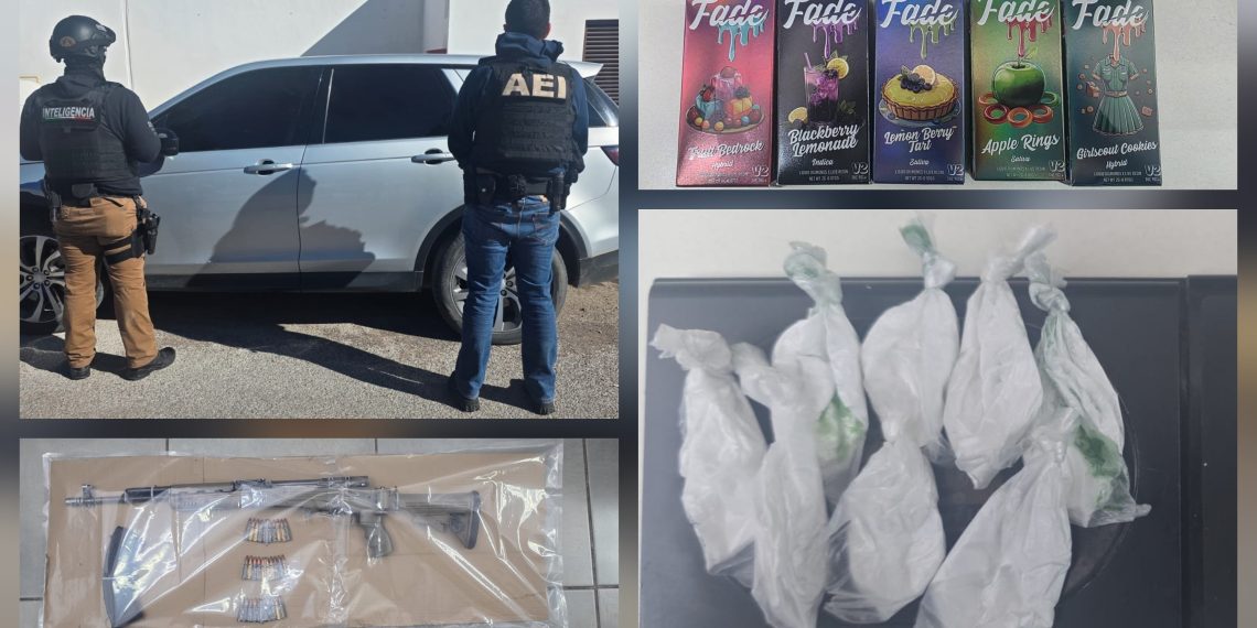 Elementos de la Agencia Estatal de Investigación en coordinación con personal de la Secretaría de Seguridad Pública Estatal (SSPE), aseguraron un vehículo de la marca Land Rover, en cuyo interior se encontraba un arma larga, cocaína y vapeadores.