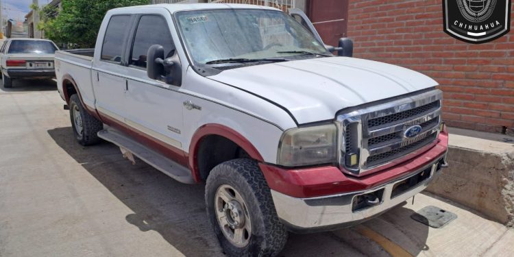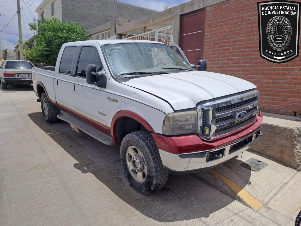 Elementos de la Agencia Estatal de Investigación (AEI) de la Fiscalía de Distrito Zona Sur en el municipio de Hidalgo del Parral, recuperaron una pick up de la marca Ford, línea F250, modelo 2005, de color blanco con una franja guinda, que contaba con reporte de robo interpuesto el 02 de diciembre de 2005, en El Paso, Texas.