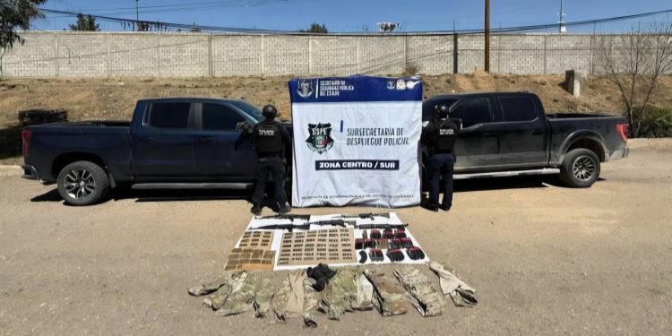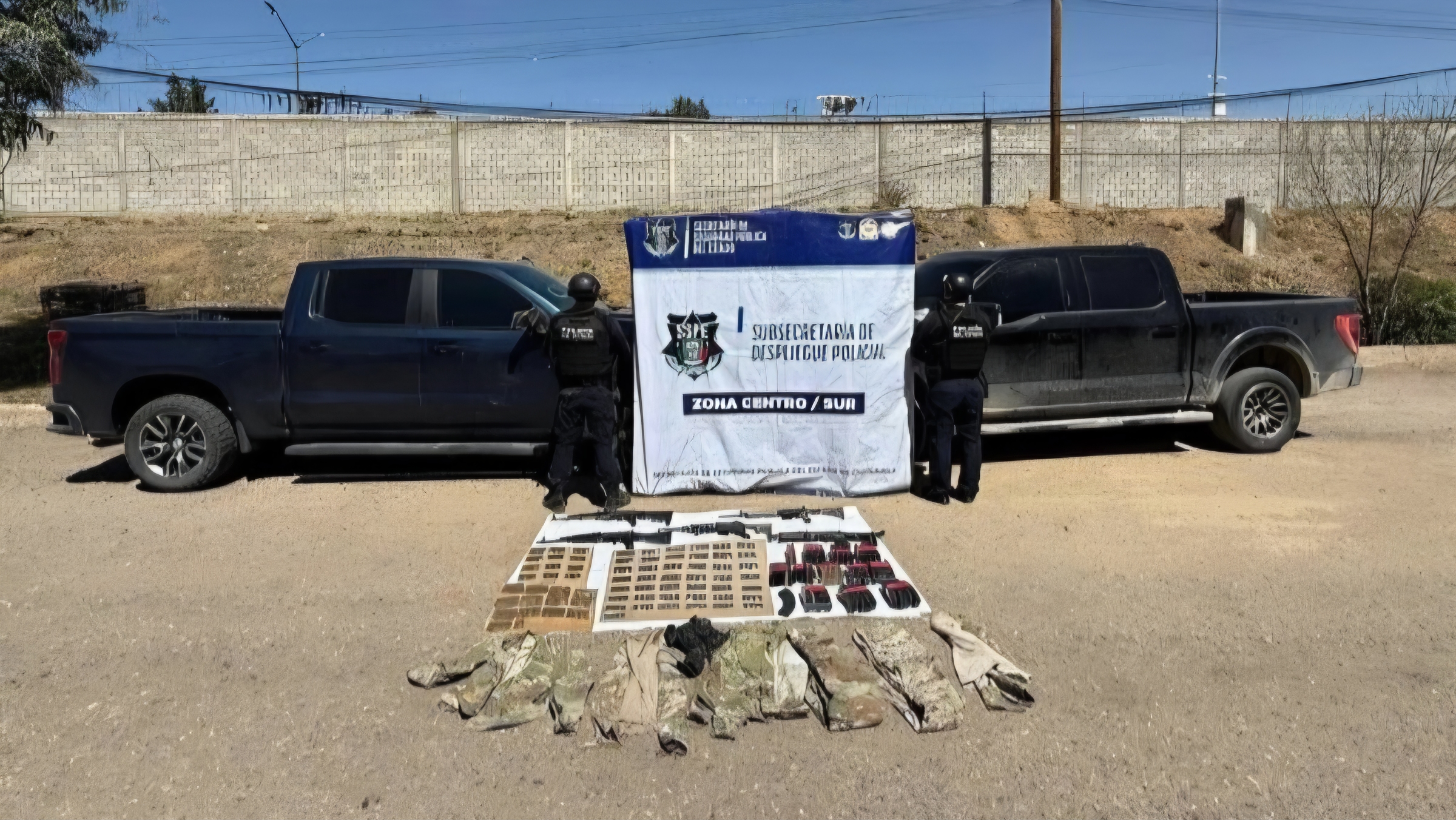 La Secretaría de Seguridad Pública del Estado (SSPE), en coordinación con la Secretaría de la Defensa, llevó a cabo el aseguramiento de dos vehículos con reporte de robo, así como armas de fuego y equipo táctico.