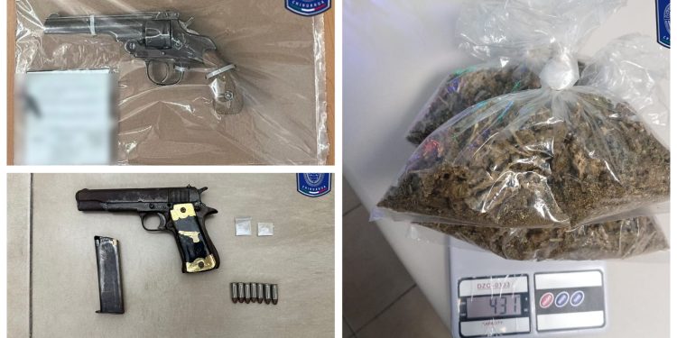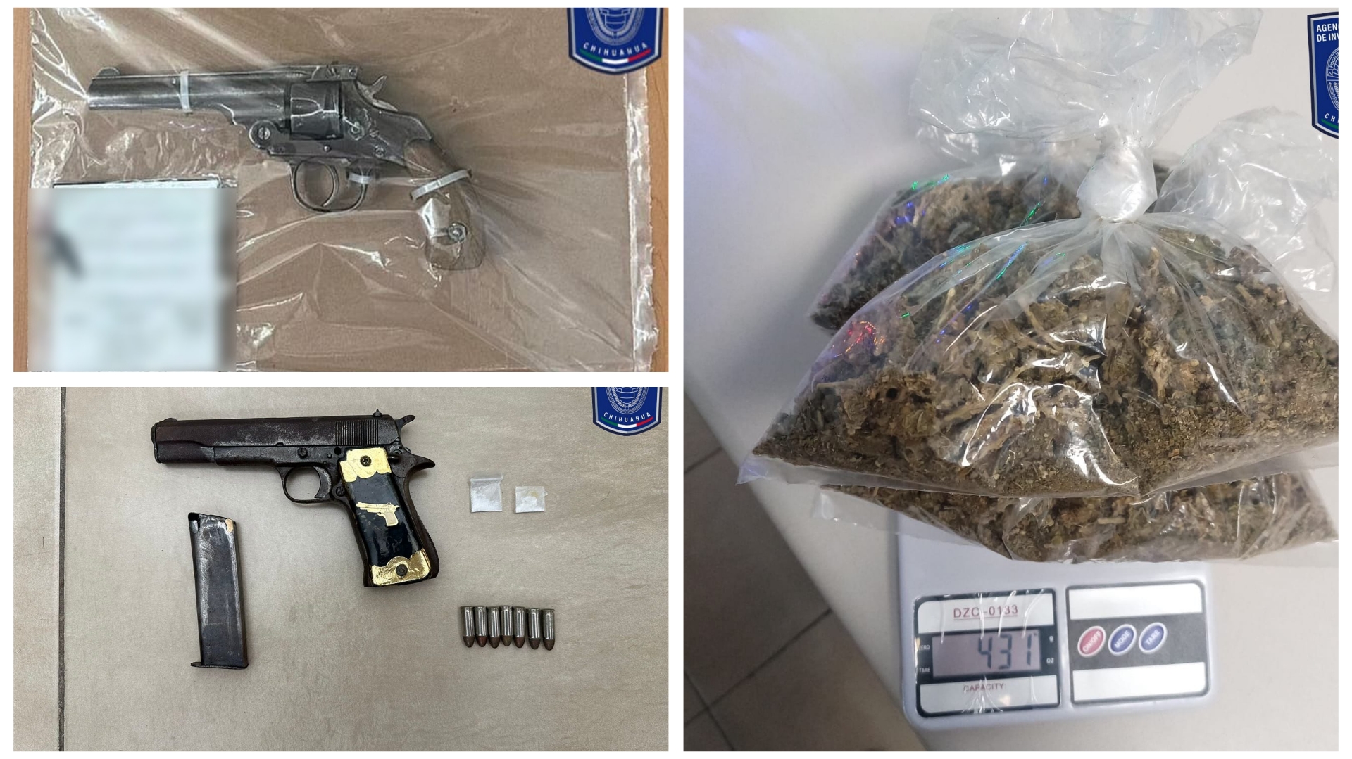 La primera intervención tuvo lugar cuando los Policías Investigadores inspeccionaron unas tapias ubicadas en la calle Calandria, de la colonia Valle Verde, en donde localizaron una pistola tipo revolver, calibre 380 y tres bolsas de plástico que contenían 431 gramos de marihuana.