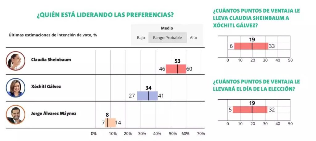 Al 29 de mayo, el modelo posicionó a Sheinbaum en la delantera con aproximadamente 53% de las intenciones de voto; seguida de Gálvez, quien tiene 34% de la intención del voto, y Jorge Álvarez Máynez, de Movimiento Ciudadano, con 8%