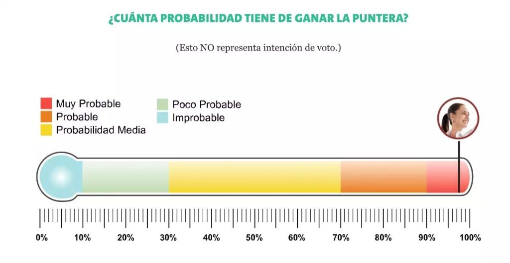 Para la probabilidad de ganar a cada candidato, se calcularon los posibles escenarios que pueden ocurrir para el día de la elección, lo que resultó que en 98% de ellos eran favorables para Sheinbaum, aunque en diferente proporción.