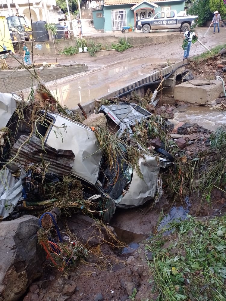 El fuerte caudal por la caída de agua causó además la inundación repentina de calles y arrastró vehículos particulares y de la compañía minera Palmarejo.