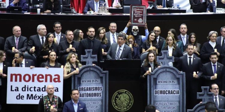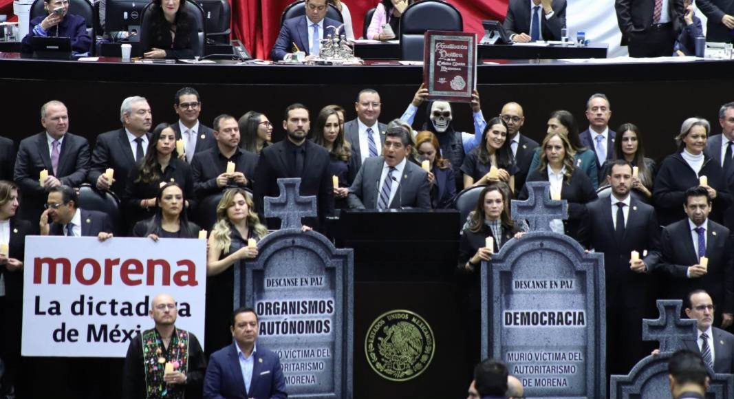 La sesión también fue escenario de protestas simbólicas. La diputada del PAN, Annia Sarahí Gómez Cárdenas, acudió a la tribuna acompañada de veladoras y lápidas, simbolizando lo que, en su opinión, es la muerte de la democracia y el Estado de Derecho en México.