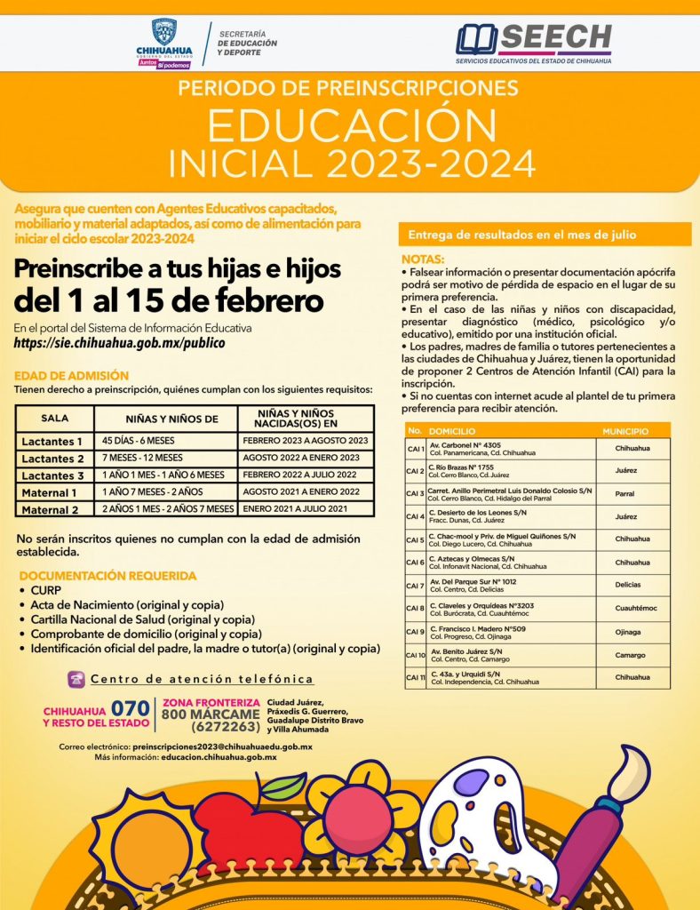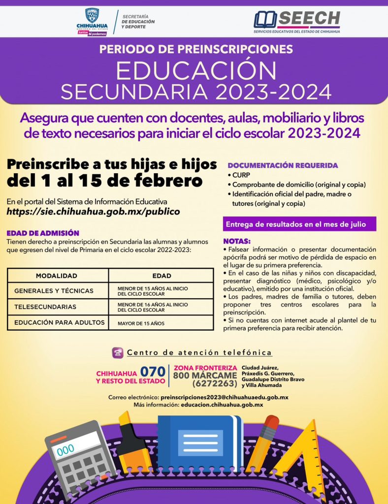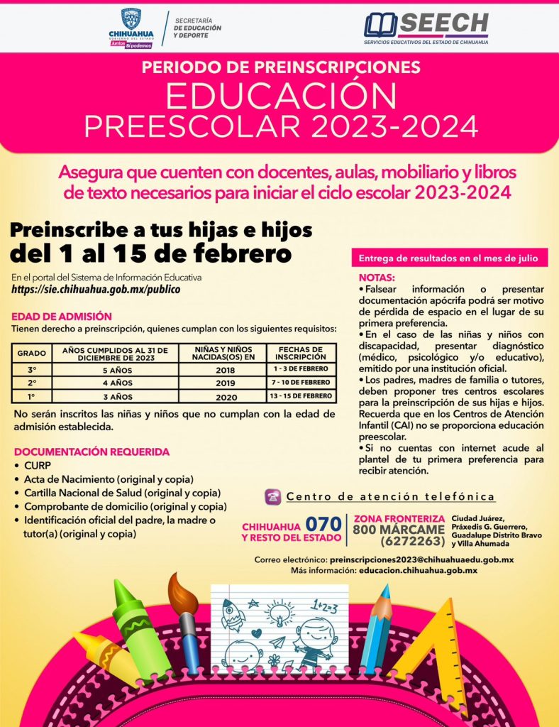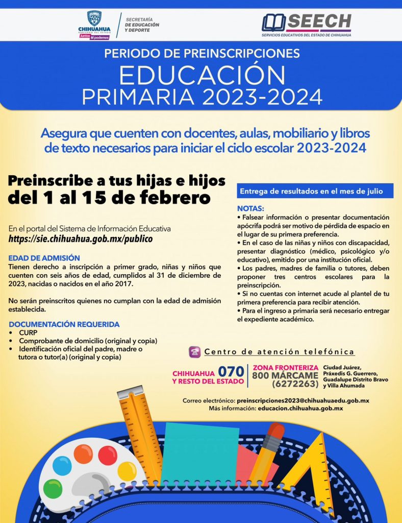 Para mayor información sobre el proceso se debe llamar al teléfono 070 para Chihuahua y el resto del estado, mientras que para la zona fronteriza se cuenta con el número 800 (MARCAME) 6272263. También se puede mandar un correo electrónico a preinscripciones2023@chihuahuaedu.go .mx que es el e-mail habilitado para esta finalidad.