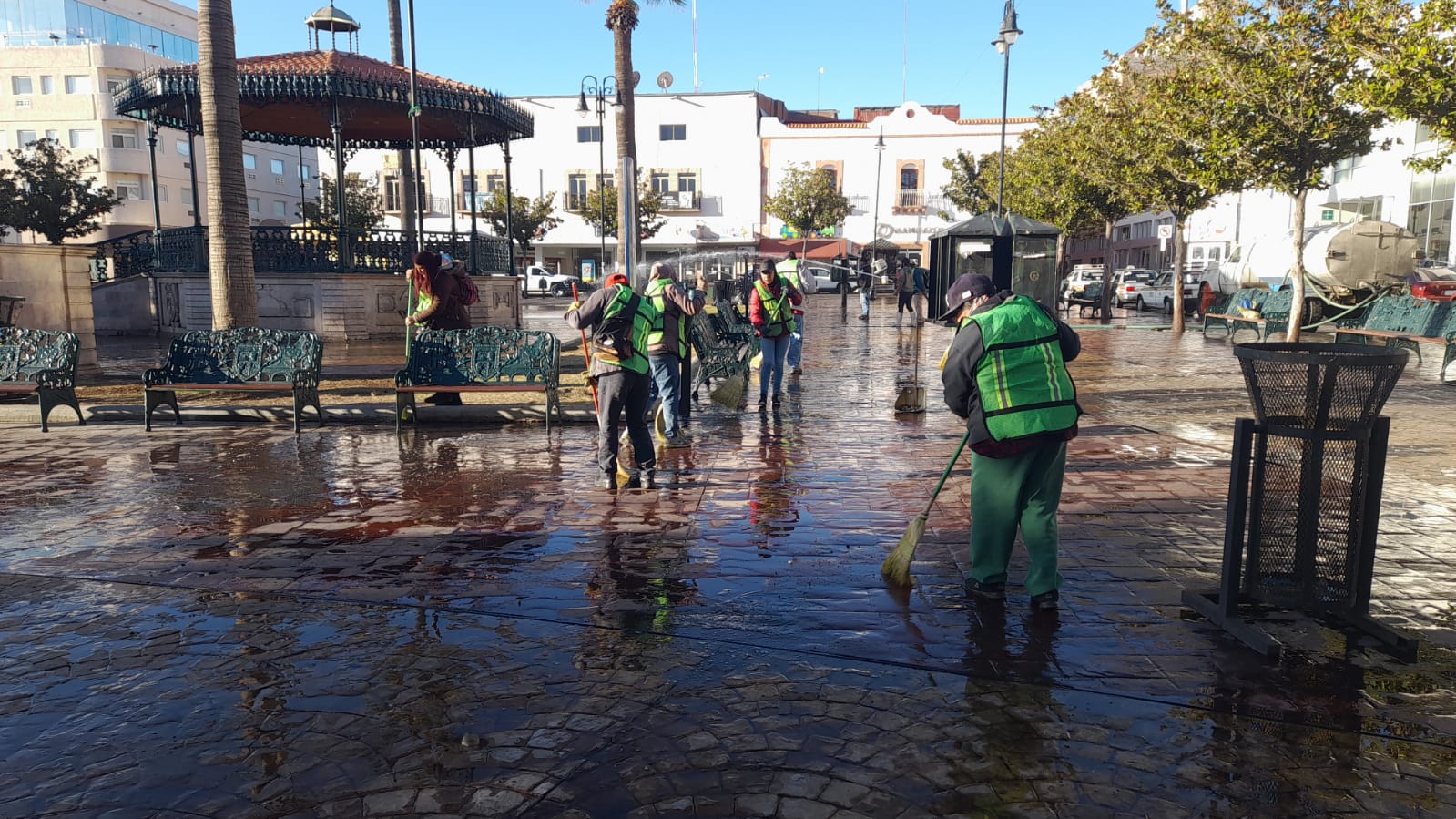 Brinda Servicios Públicos exhaustiva limpieza a la Plaza Principal