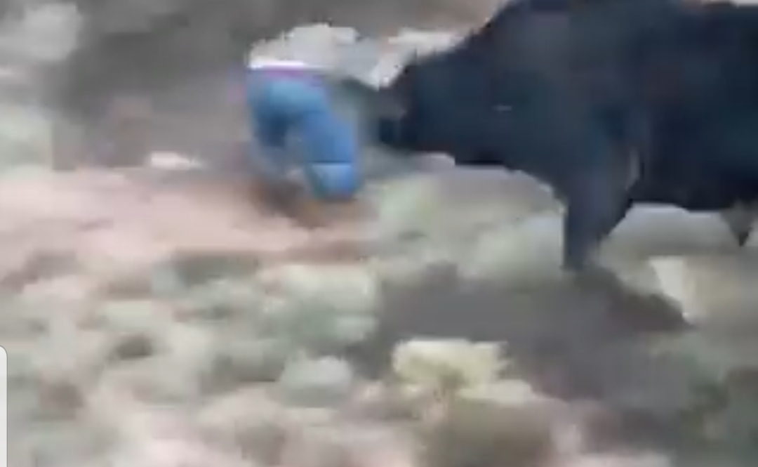 En el video se puede ver cómo un hombre dispara contra el búfalo y éste se lanza contra él. Como puede corre y trata de alejarse de él. Sin embargo, es embestido. Finalmente, los otros hombres también disparan contra el animal para así quitarle la vida.