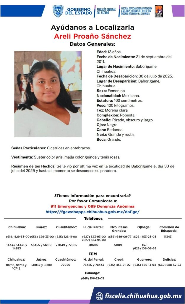 La Fiscalía General del Estado de Chihuahua emitió una pesquisa para localizar a Areli Proaño Sánchez, una adolescente de 13 años que fue reportada como desaparecida desde el pasado 30 de julio de 2025 en la comunidad de Baborigame.