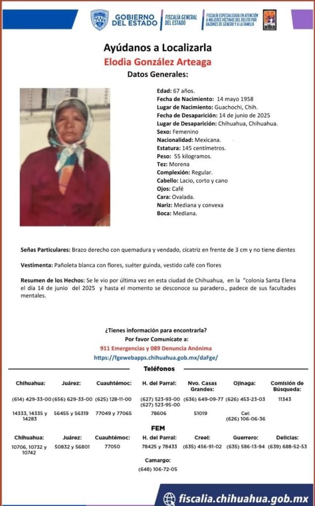 La Fiscalía General del Estado (FGE) activó una pesquisa para localizar a Elodia González Arteaga, de 67 años, quien fue vista por última vez la tarde del 14 de junio de 2025 en la colonia Santa Elena, al sur de la capital del estado. Desde entonces se desconoce su paradero.