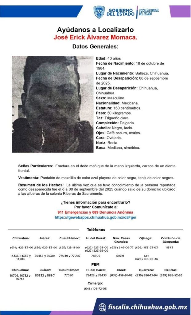 Autoridades estatales mantienen activa la búsqueda de José Erick Álvarez Momaca, originario del municipio de Balleza, quien fue reportado como desaparecido desde el 08 de septiembre de 2025, tras salir de su domicilio ubicado a las afueras de la colonia Riberas de Sacramento, en la ciudad de Chihuahua.