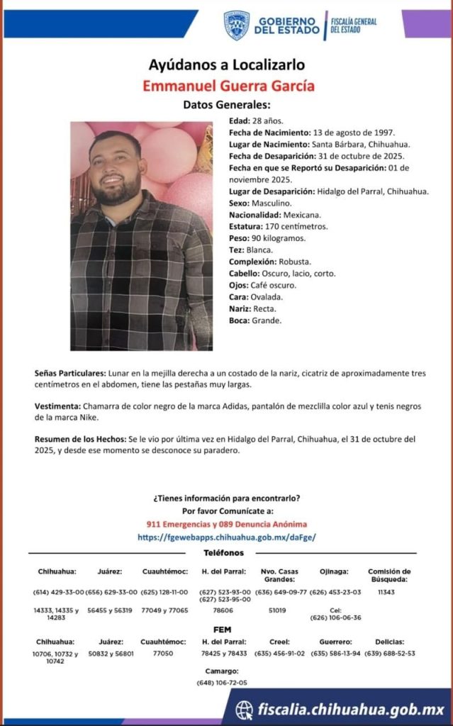 La Comisión de Búsqueda de Personas del Estado de Chihuahua solicita la colaboración de la ciudadanía para localizar a Emmanuel Guerra García, de 28 años, quien fue visto por última vez el 31 de octubre de 2025 en Hidalgo del Parral, sin que hasta el momento se tenga información sobre su paradero.